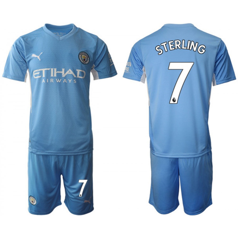 Men's Manchester City #7 Raheem Sterling 2021/22 Blue Home Soccer Jersey Suit