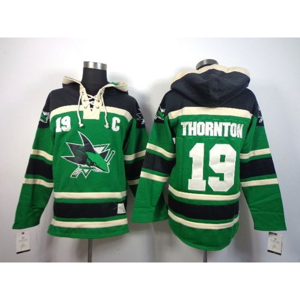 Sharks #19 Joe Thornton Green St. Patrick's Day McNary Lace Hoodie Stitched NHL Jersey
