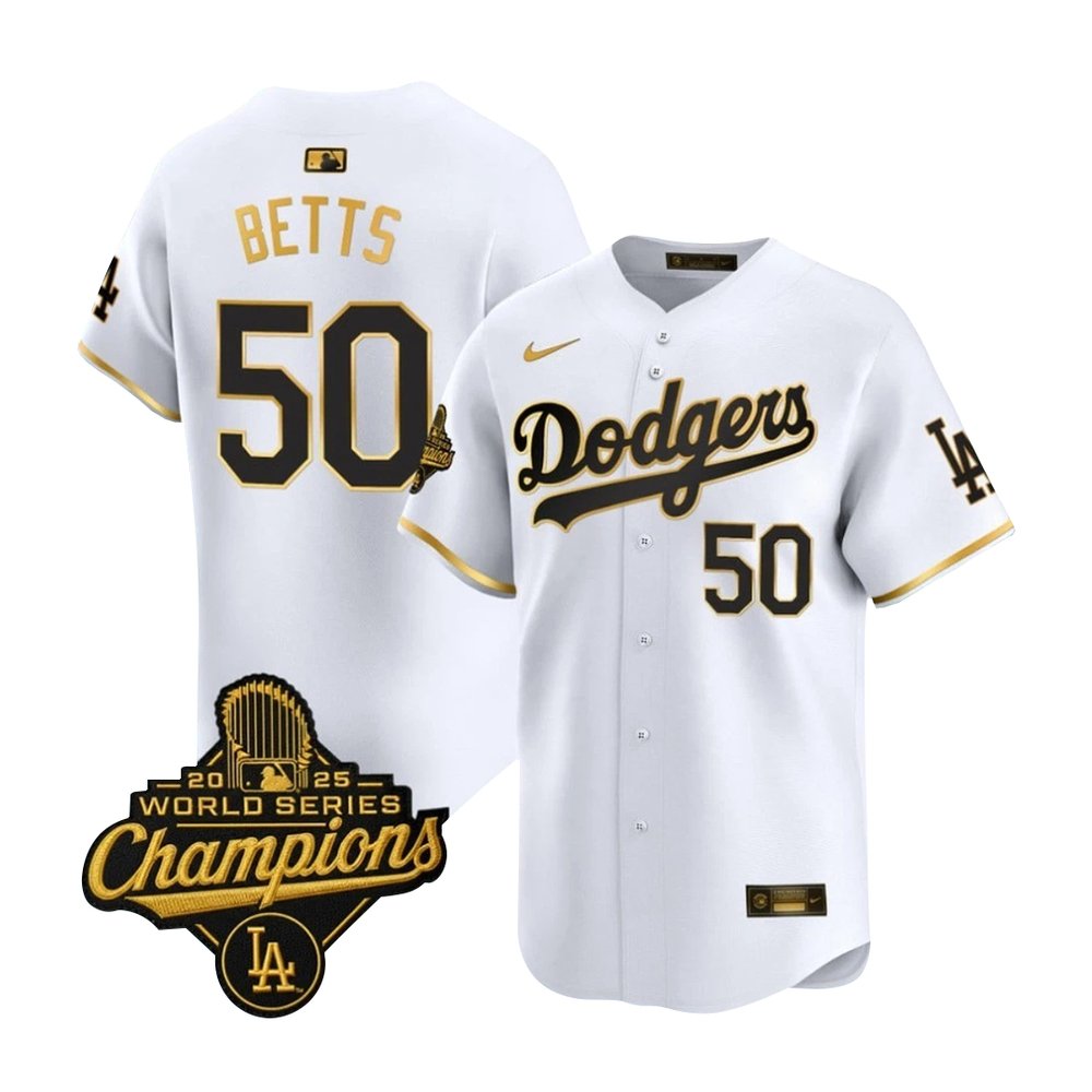 Men's Los Angeles Dodgers #50 Mookie Betts White Golden 2025 World Series Champions Home Limited Jersey